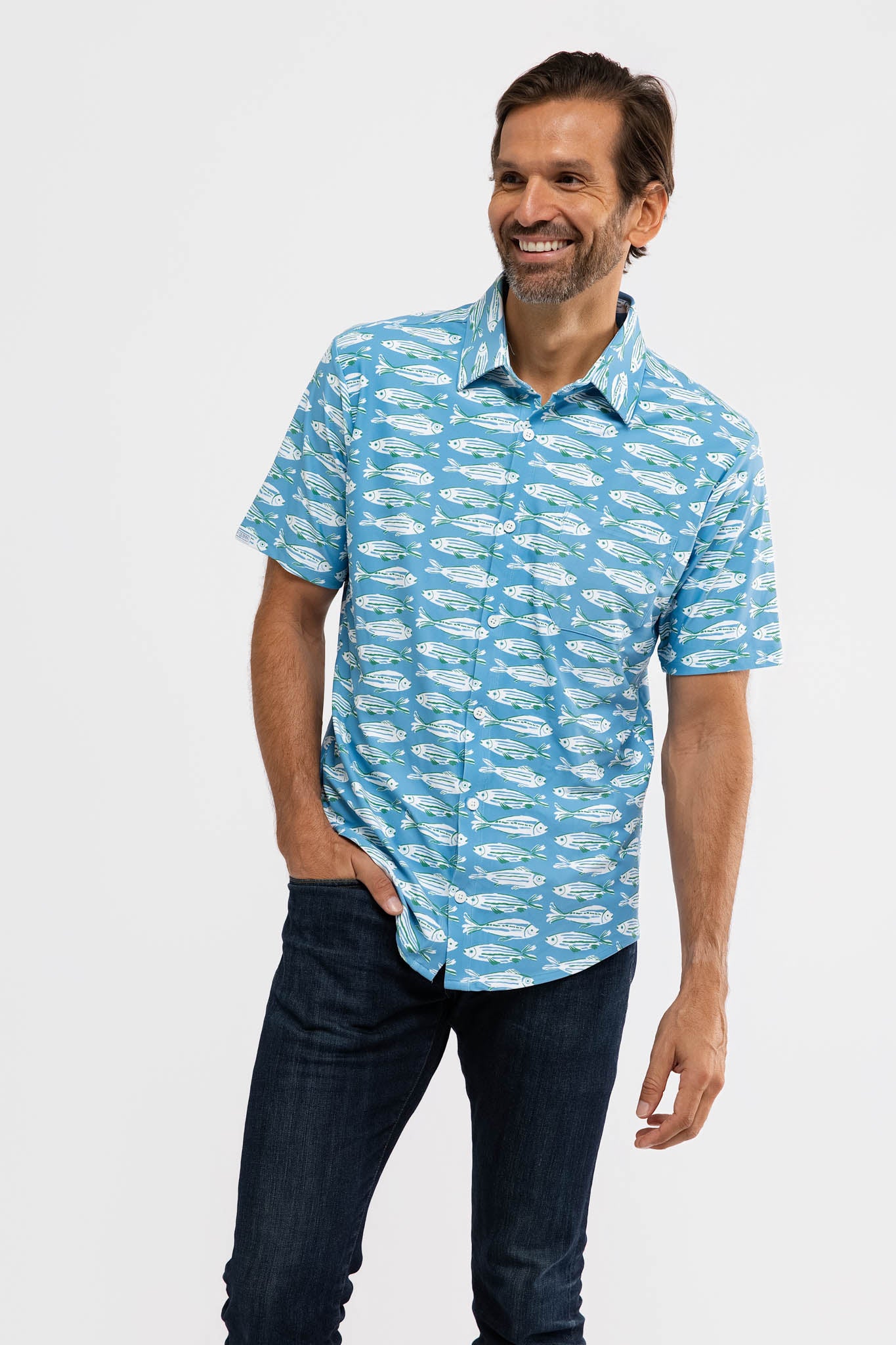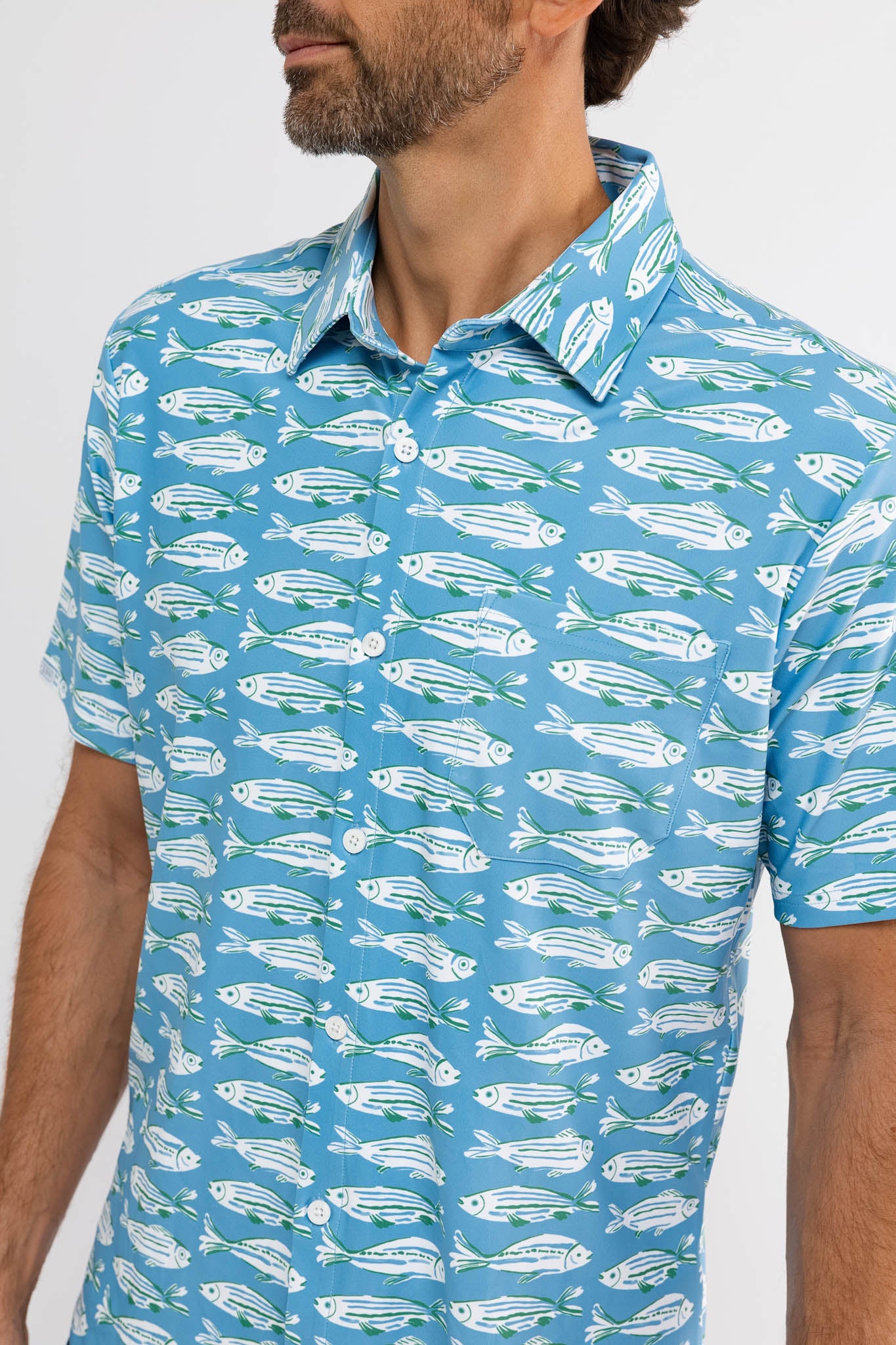 Meet the Boatyard Button-Down. Crafted from our S&Q Stretch fabric, the Boatyard features a versatile button-down style with a collared neckline and chest pocket.