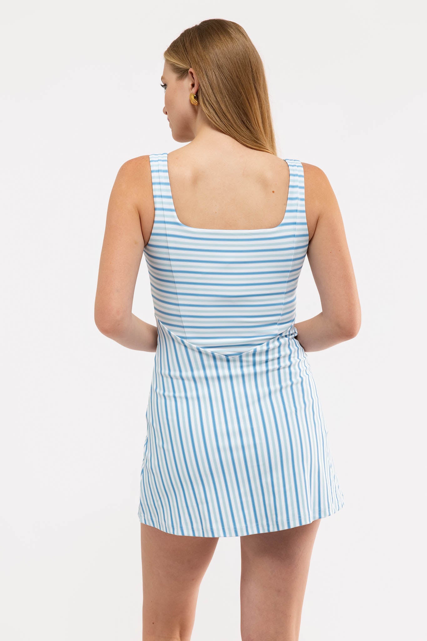 Meet the Lillian Dress. Crafted from a performance stretch fabric, the Lillian features a flirty silhouette with a square neckline and flattering waistline.
