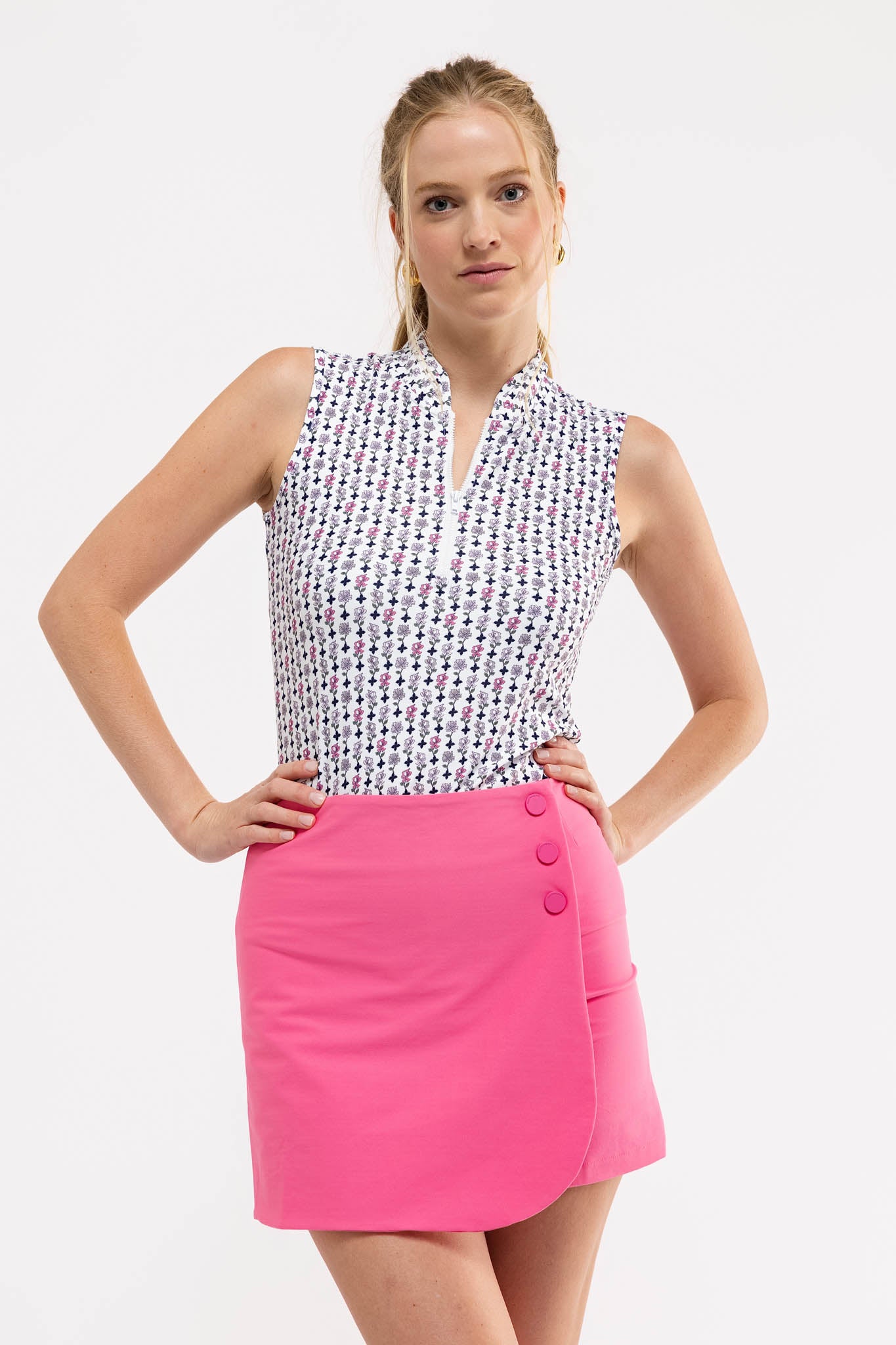 Meet the Lainie Skort. Crafted from a performance stretch woven fabric, the Lainie features a polished, longer-length style with a wrap design and button-front accents.