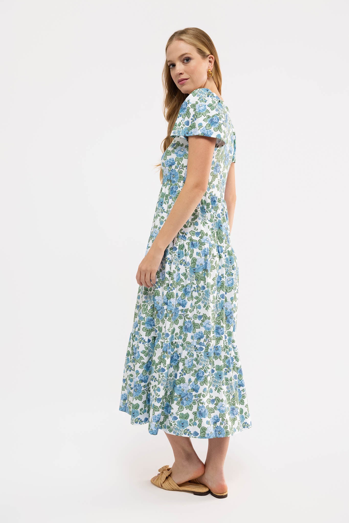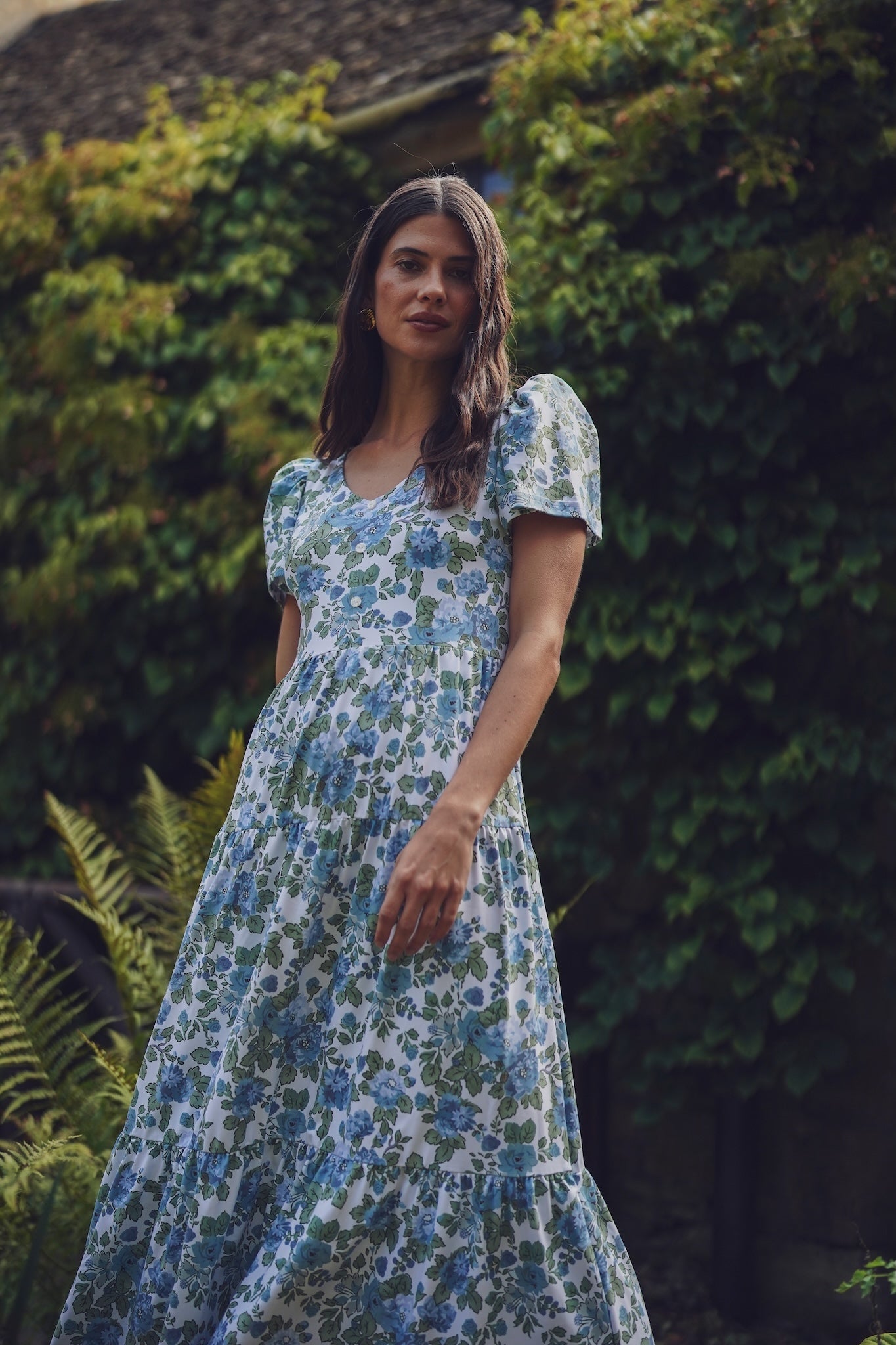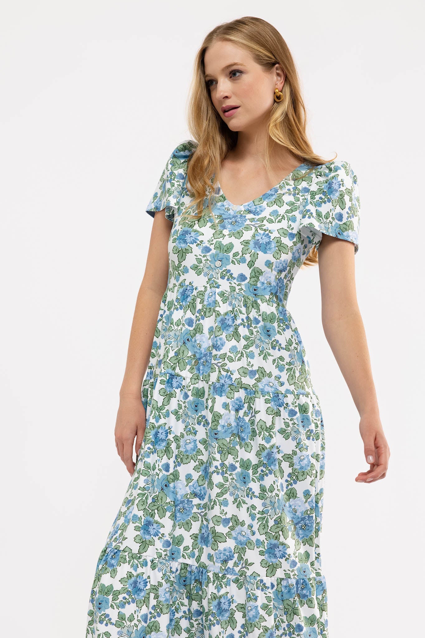 Meet the Agatha Dress. Crafted from our S&Q Stretch fabric, the Agatha features a feminine maxi silhouette with decorative button detailing and a tiered skirt.