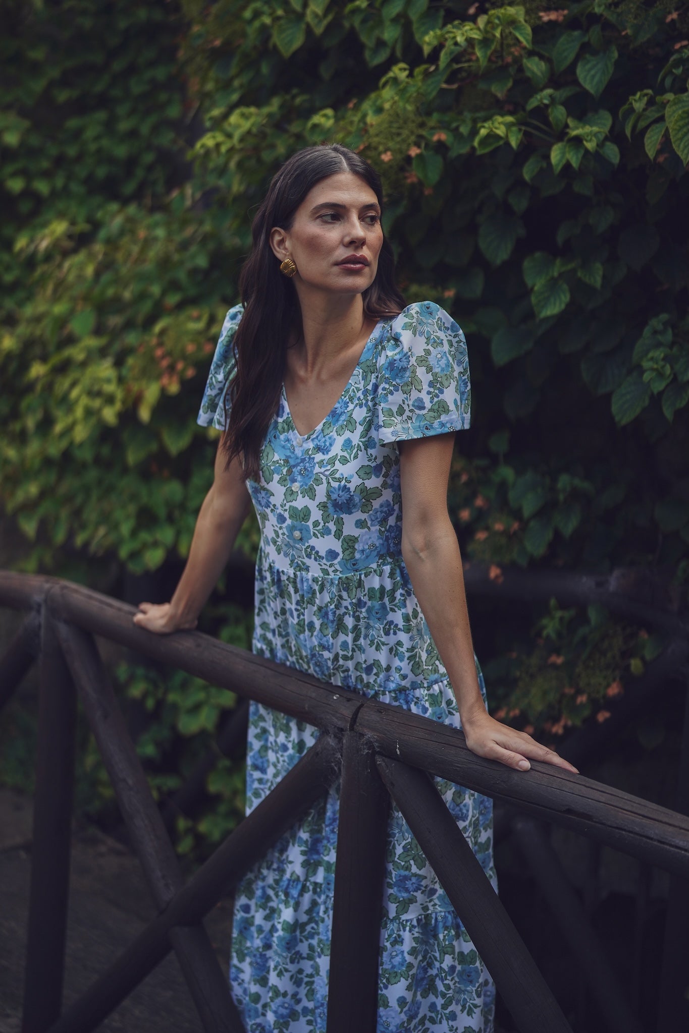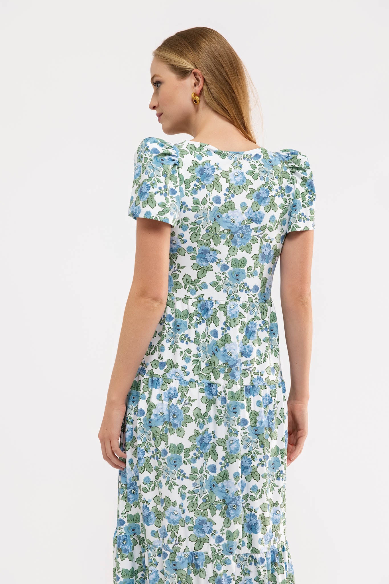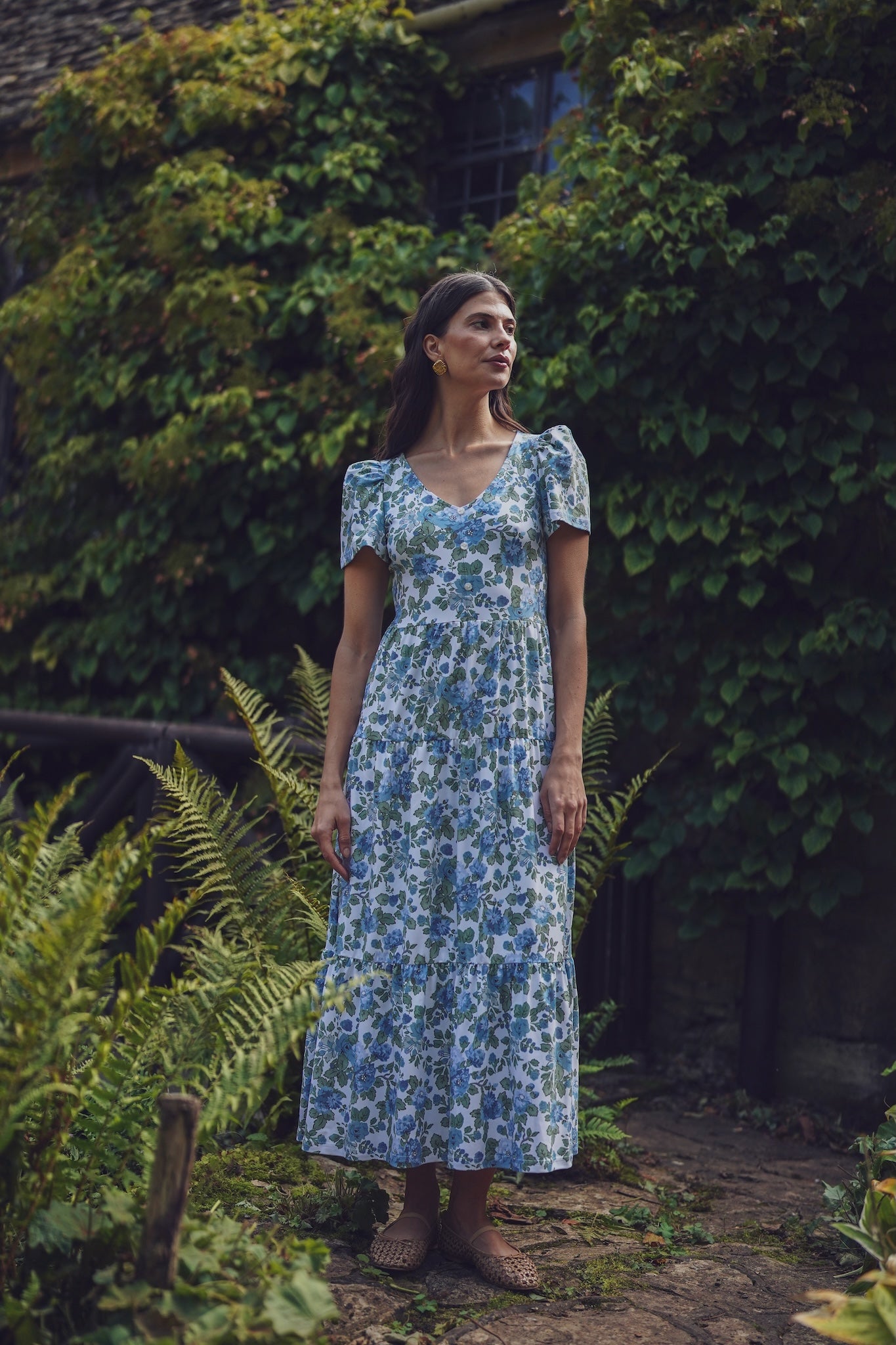 Meet the Agatha Dress. Crafted from our S&Q Stretch fabric, the Agatha features a feminine maxi silhouette with decorative button detailing and a tiered skirt.