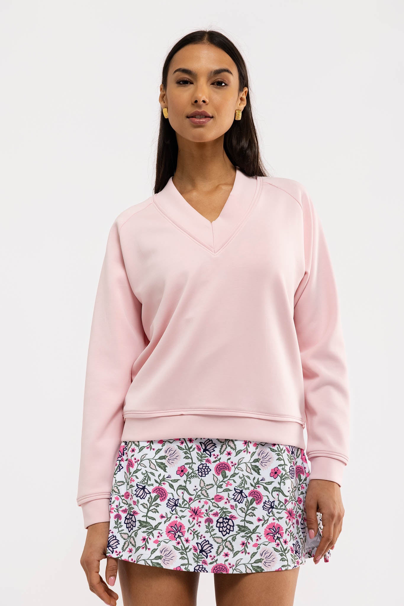 Meet the Candace Pullover. Crafted from a buttery stretch double knit fabric, the Candace features a buttery-soft, V-neck style with a relaxed fit.