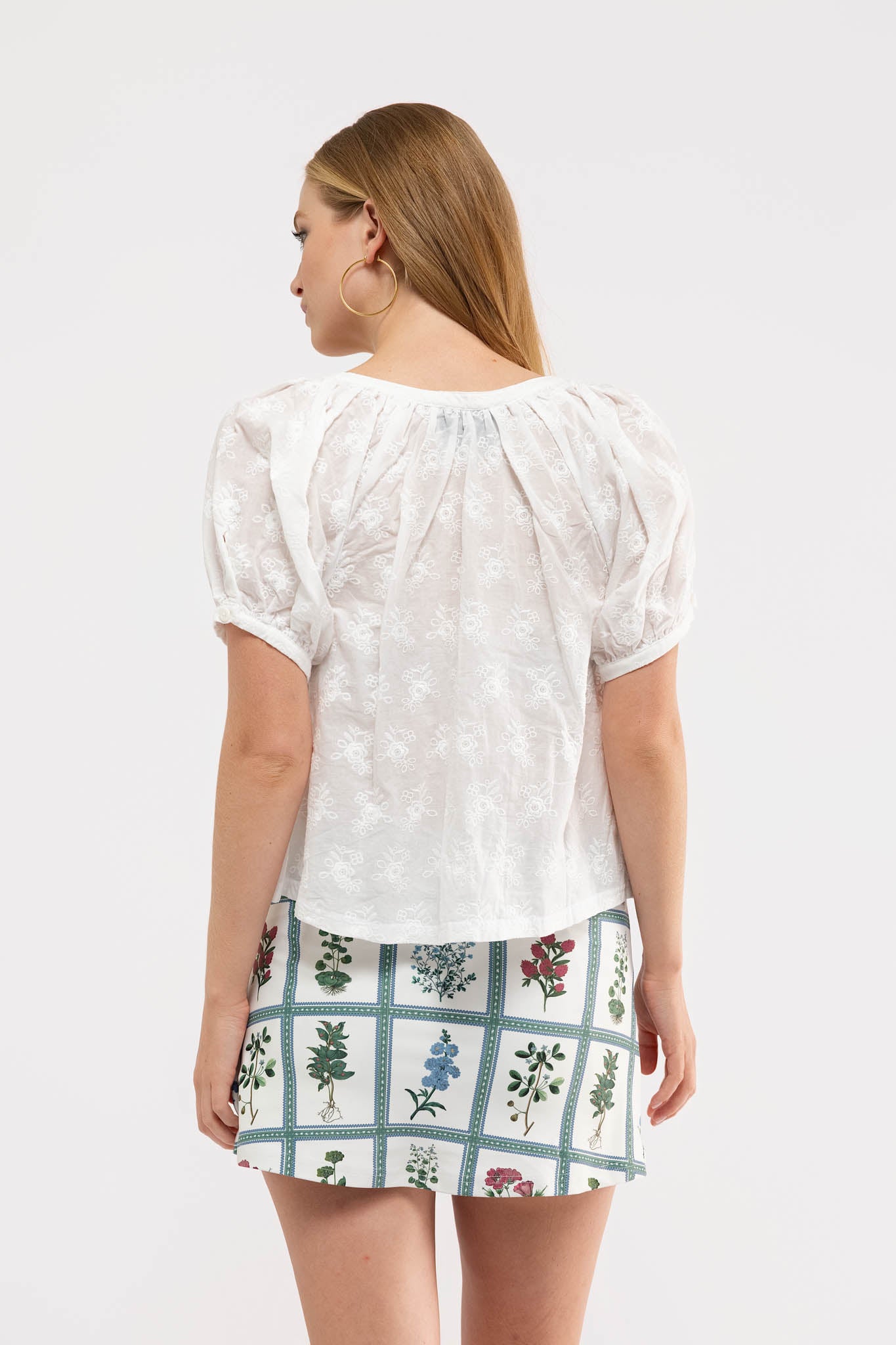 Meet the Imogen Top. Crafted from a cotton eyelet fabric, the Imogen features a vintage-inspired silhouette, subtle puff sleeves, and breezy fabric for all-day wear.